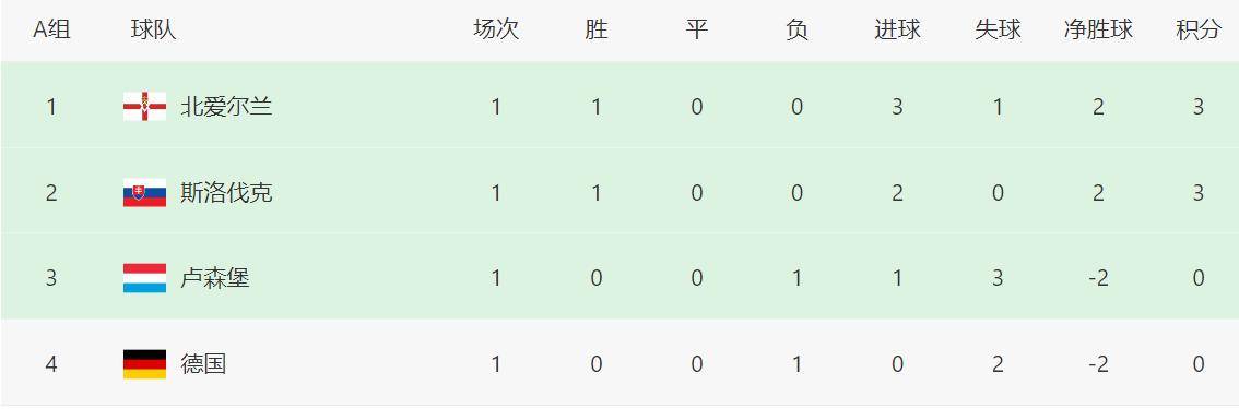 更令人担忧的是,这场失利让德国队在小组积分榜上尴尬垫底。由于一球未进且净失两球,德国队甚至落后于同样首轮告负的卢森堡队(后者因有进球而排名小组第三),而北爱尔兰和斯洛伐克则分列小组前两位。赛后,德国队主帅纳格尔斯曼严厉批评了球队的表现:\每名球员都应该以踢半决赛的态度来对待这样的比赛!带着手刹踢球是远远不够的。德国杯经常上演弱胜强的戏码,这应该给我们敲响警钟。\