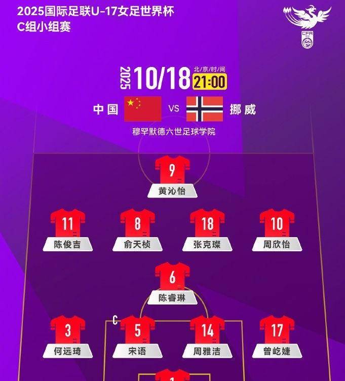 面对欧洲亚军挪威队,主帅王洪亮派出了由门将牛子琪,后卫何远琦、宋语、周雅洁、曾屹婕,中场陈睿琳、俞天桢、张克璨,以及前锋黄沁怡、周欣怡、陈俊吉组成的首发阵容。