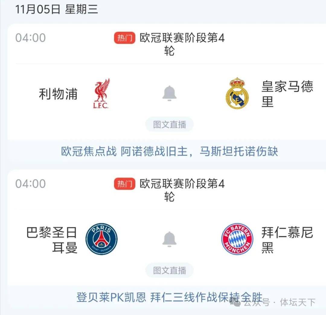 世界杯,2026世界杯,世界杯直播,世界杯投注,世界杯盘口,世界杯比分预测,聚焦2026年世界杯,提供最全面的赛程、直播、比分、投注推荐与爆冷预测信息。中文用户专属足球社区,助您精准分析,轻松购彩。欧冠小组赛,强强对决还是比较少的。今晚,欧冠小组赛第四轮开打,倒有两场真正的强强对决,巴黎圣日耳曼VS拜仁,利物浦VS皇马,参赛的四队和阿森纳、曼城是欧冠夺冠赔率榜上的前六名。