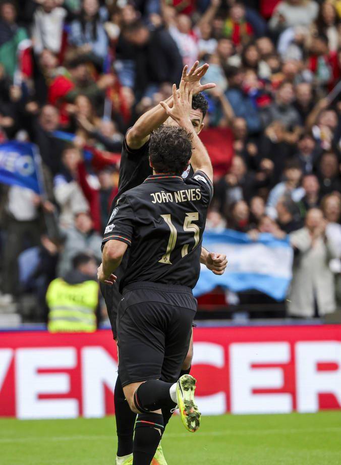 20岁的若昂·内维斯更是惊艳。 他的三个进球方式多样,远射、任意球、凌空抽射,全面展现了中场球员的进攻天赋。 要知道,在C罗主导进攻的体系里,中场球员很少能得到这么高的开火权。