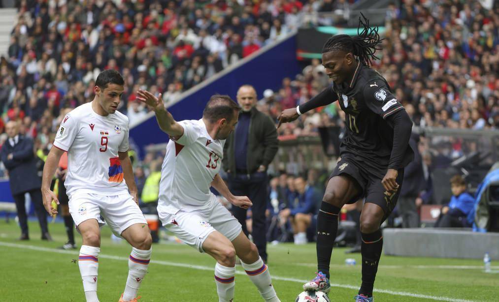 从第28分钟开始,比赛彻底变成了一场屠杀。 亚美尼亚后卫塞罗比扬的回传失误,被贡萨洛·拉莫斯断下,他晃过门将推空门得手。 2分钟后,若昂·内维斯禁区弧顶一脚爆射破门,比分变成3-1。
