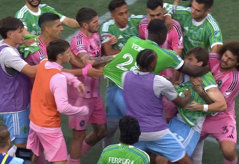 一位身穿替补背心的迈阿密球员在与对方干架中被揪翻在地,场面十分火爆。布斯克茨、德保罗、苏亚雷斯等多位迈阿密国际大牌球员也卷入冲突。