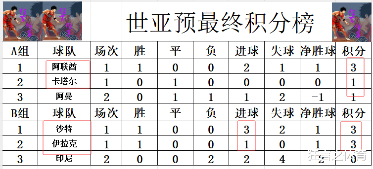 - B组方面:虽然伊拉克赢球,但进球数仍少于同组的沙特,排名第二。与对手相同的情况一样,最后一轮伊拉克若想直接获得世界杯参赛名额,必须在最后一轮与卡塔尔的对决中取胜。印尼则在两连败后提前锁定小组垫底,提前无缘世界杯。
