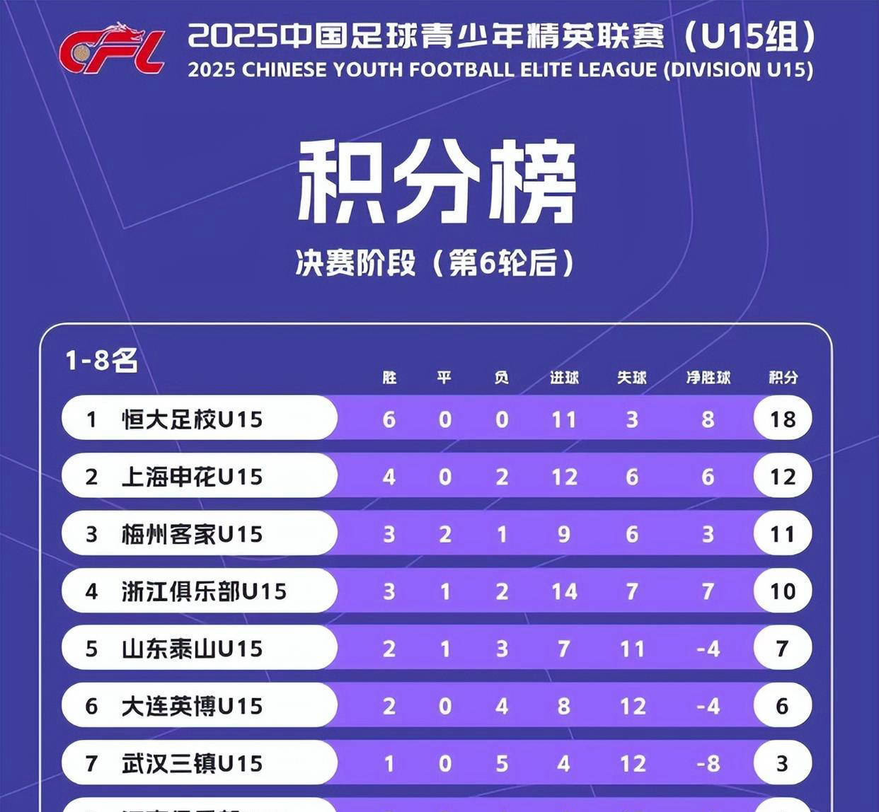 名单中比较吸引眼球的是,有3名现效力于日本联赛的少年足球天才赫然在列,但来自梅州客家和大连英博这两支实力不俗的队伍的同龄球员却非常少。至于恒大足校U15队,在国内该年龄段堪称一枝独秀,2025年中青赛期间他们以领先第二名6分的优势提前一轮加冕冠军,实力毋庸置疑,是公认的顶尖球队。