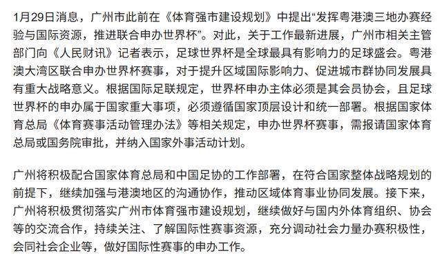 1月29日看到了一篇报道,广州市此前在《体育强市建设规划》中提出,「发挥粤港澳三地办赛经验与国际资源,推进联合申办世界杯。」